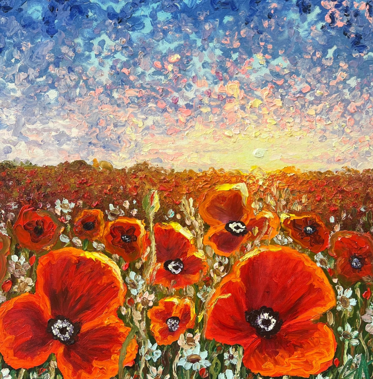 One of my very best friends came over to paint together. We looked through several images and found that we wanted to do a pastel sky and a poppy field. We set up two canvases and started painting. We spent all day painting, catching up, and enjoying each others company. At the end, I had created Pretty in Poppies.